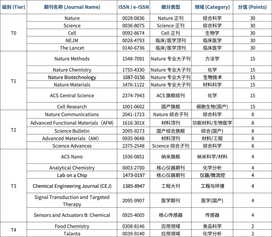 期刊范围:仅限发表于以下表格内的期刊论文参与积分累计,不在列表中的期刊(无论IF 高低)均不计入分数。
